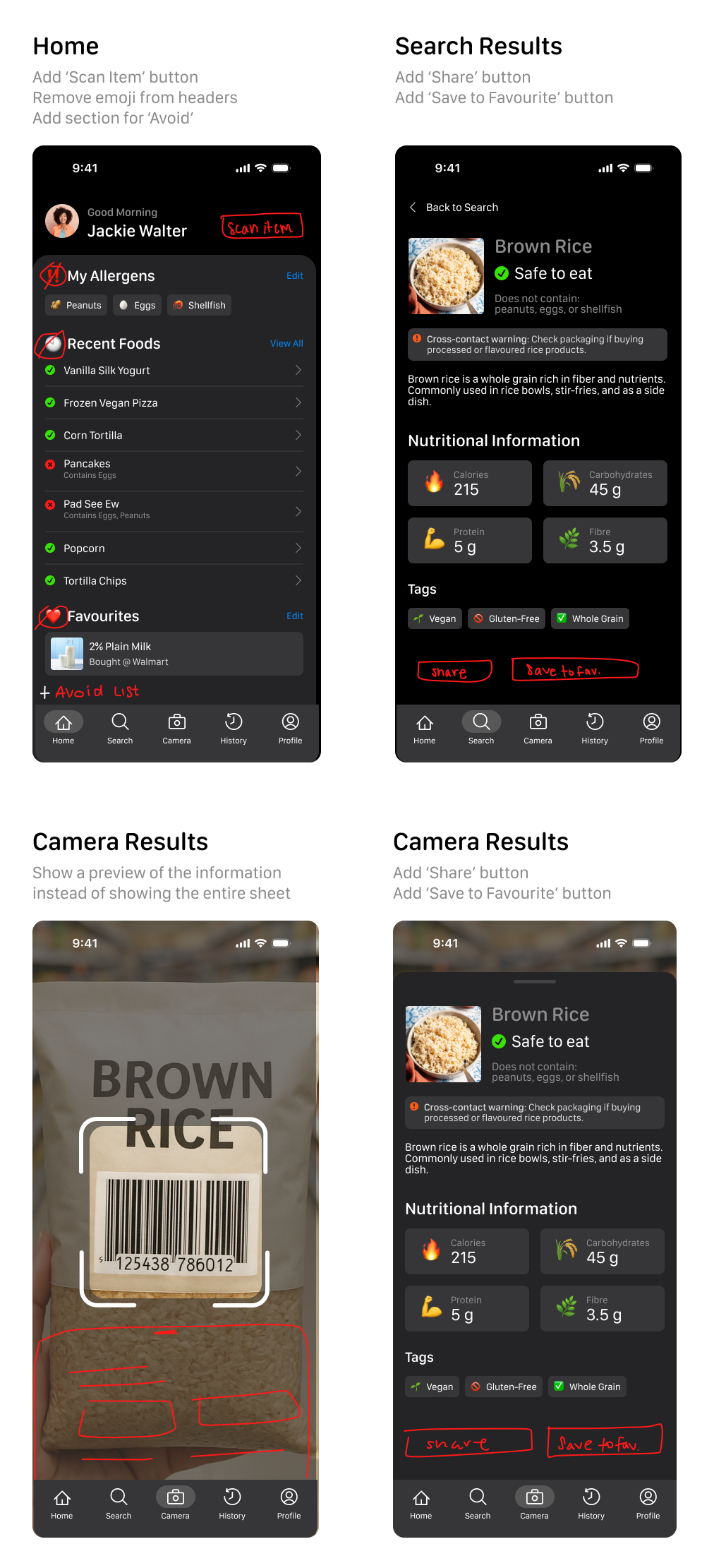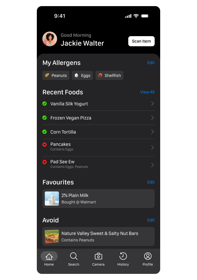 The Home page is the app’s hub, letting users quickly scan foods, view recent items, and see saved favorites or foods to avoid. It’s simple and action-focused for fast access.