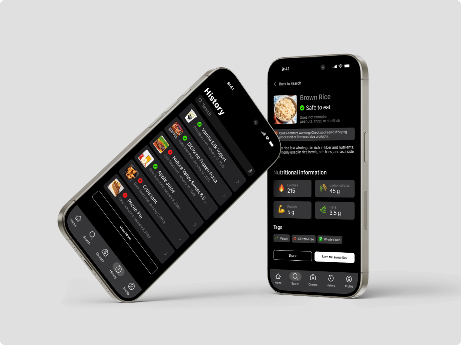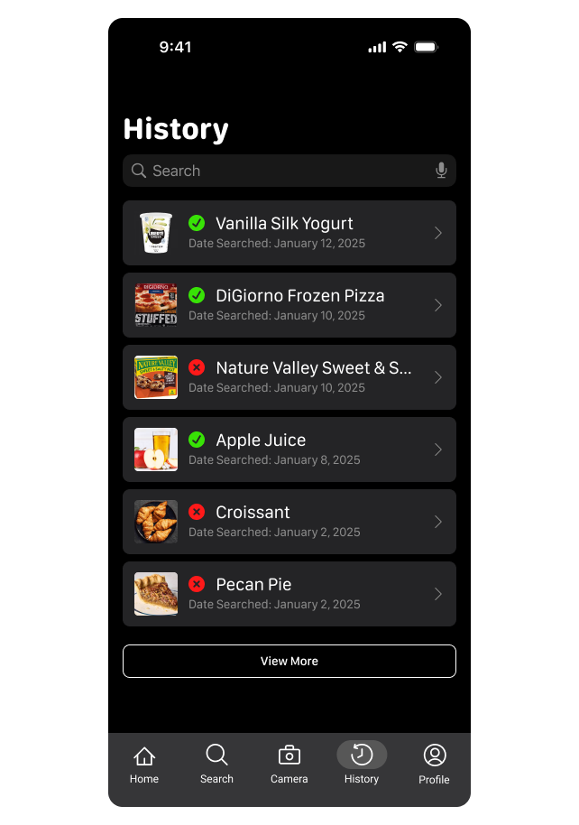 The History page tracks previously scanned or searched foods, letting users quickly revisit past items and maintain a personal record of safe and unsafe foods.