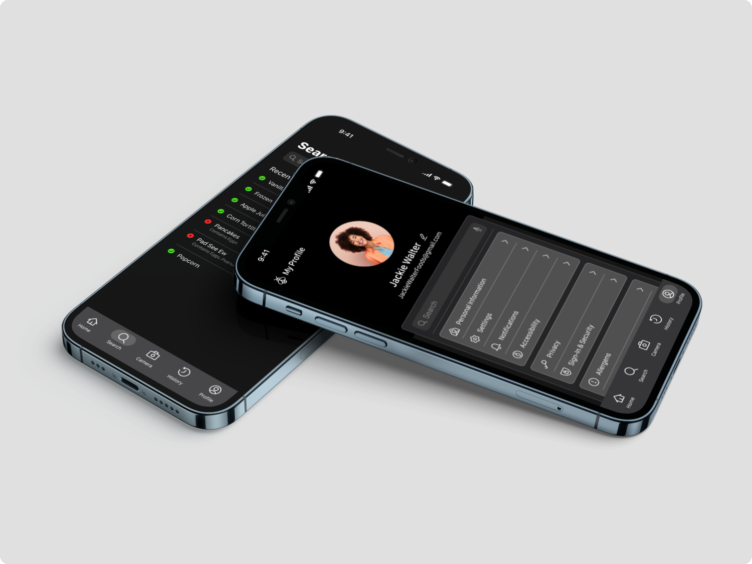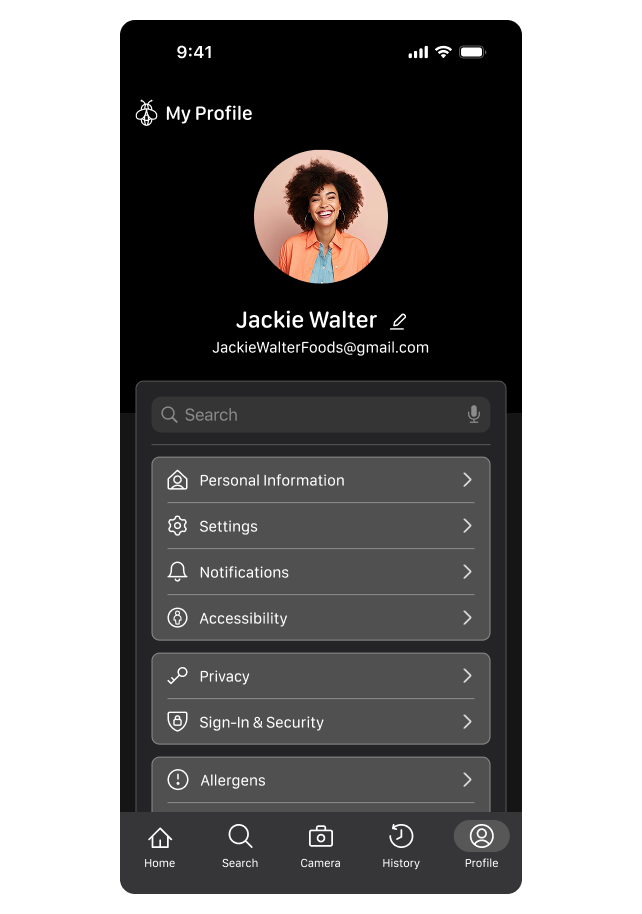 The Profile page lets users manage personal info, update allergens, and adjust app preferences to keep the app personalized.