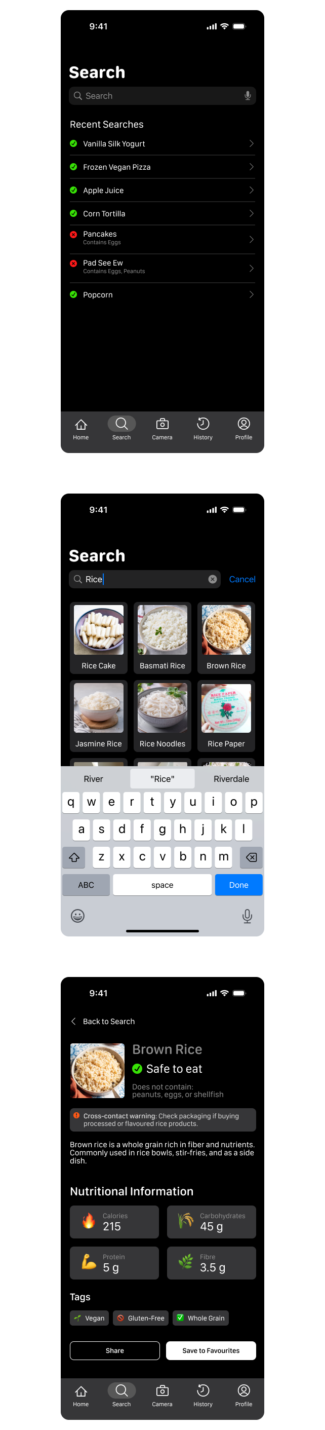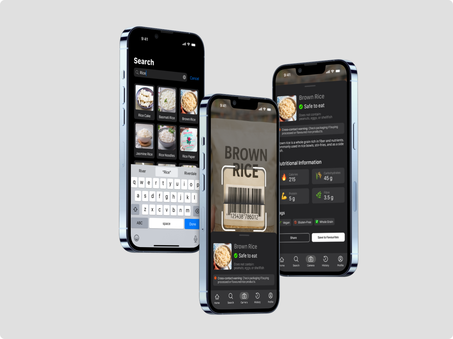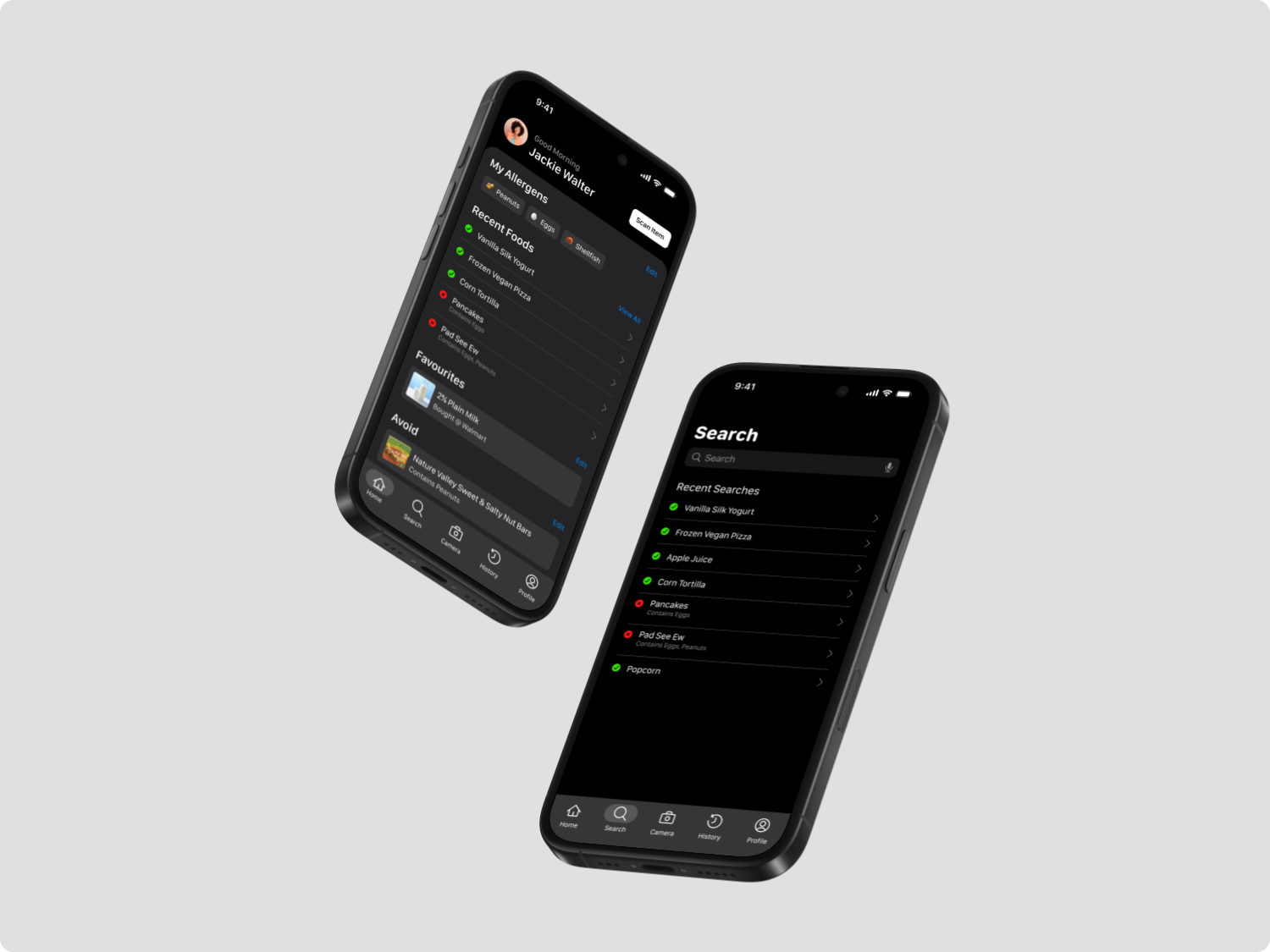 The Camera page lets users scan barcodes for instant allergen safety results.